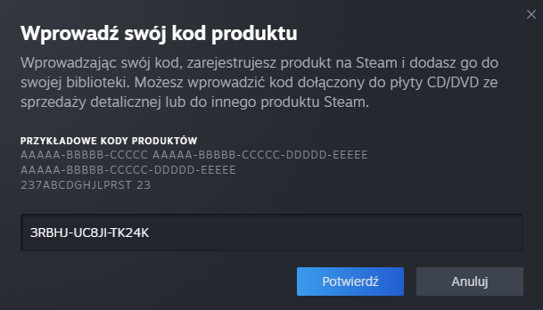 Przepisz klucz do Steam w opcji „Aktywuj produkt na Steam”